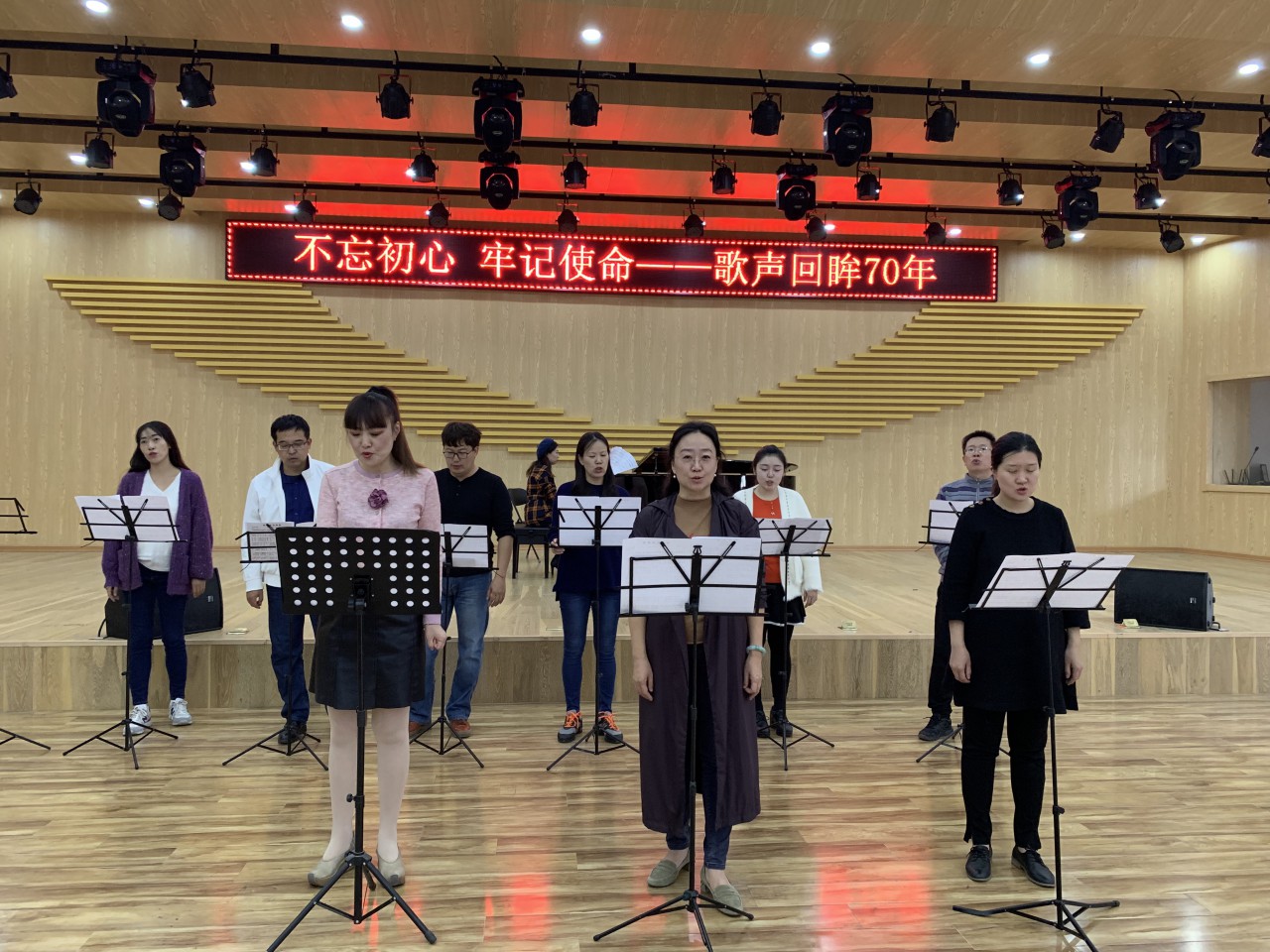 10月9日,由公司党委主办,音乐系党支部承办的“不忘初心、牢记使命---歌声回眸70年 ”主题教育活动在多功能厅举行,音乐系全体教职工党员参加了此次活动,用歌声再现历史,用旋律谱写使命。