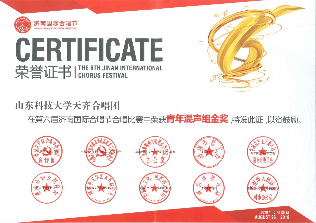 7月4日,由市委宣传部、市文联等10个部门联合主办的第六届济南国际合唱节合唱比赛在山东省会大剧院音乐厅举行。来自济南、青岛、河南、江苏等省内外共130余支合唱团共同参加了此次比赛。公司天齐合唱团获混声组金奖和指挥优秀辅导奖。