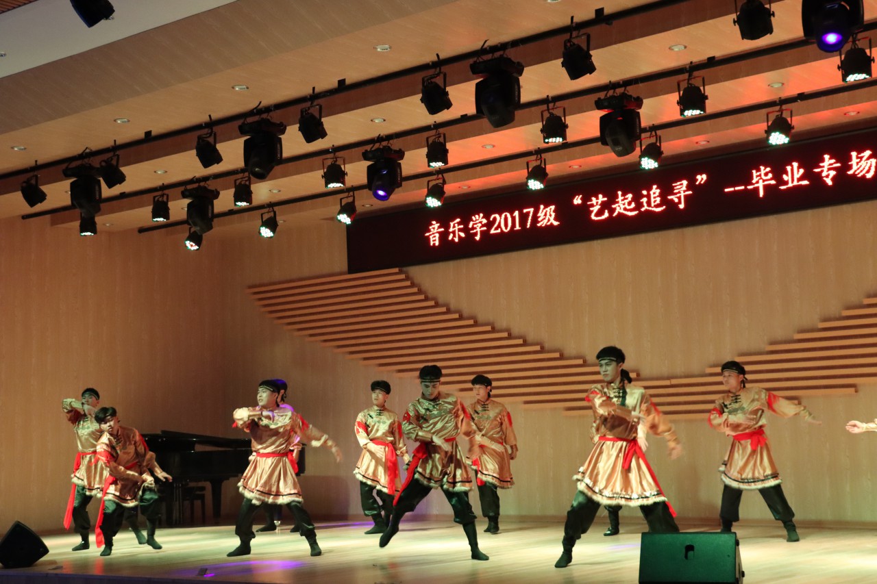 春江波滟滟,明月共潮生。在《盛世国乐》的古筝重奏声中音乐会拉开了序幕。本场音乐会的曲目汇聚了传统的毓秀和现代的雅尚风格,以多种演唱、演奏方式多元化呈现,交汇出了一场动人的生命华彩。 独唱、合唱、管乐演奏、rap、舞蹈、歌剧等形式的音乐演出,《小嘴》、《我爱我的祖国》、《百鸟朝凤》、《行者》、《少年派报告》、《等着我亲爱的人》、《花间意》、《等着我亲爱的人》等节目,天籁之音,美妙绝伦,展示了中华民族文化恒久魅力和当代中国人焕发青春的时代风采,展现出音乐系毕业生的风采。音乐在耳中跳动,音符化作精灵激动着同学们身上每一个细胞,血液在燃烧,心跳在加剧。现场观众被音乐的魅力带动的热情洋溢。本次音乐会在2017级音乐系全体同学合唱《彩虹》的感动中落下了帷幕。