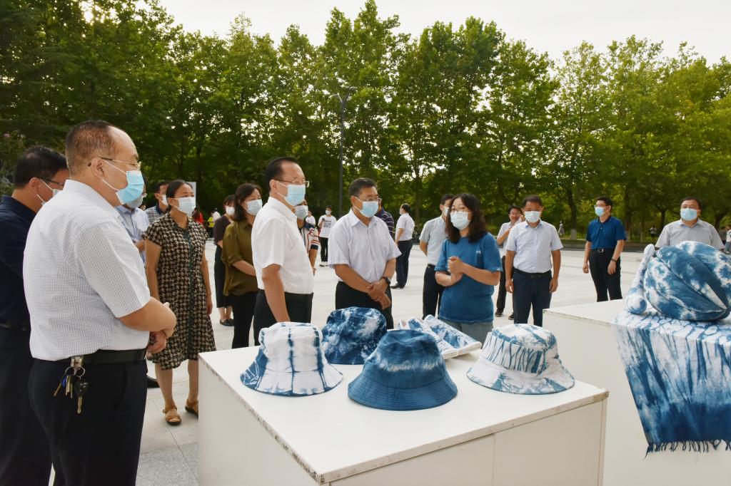罗公利与老师们现场体验蓝染方巾制作