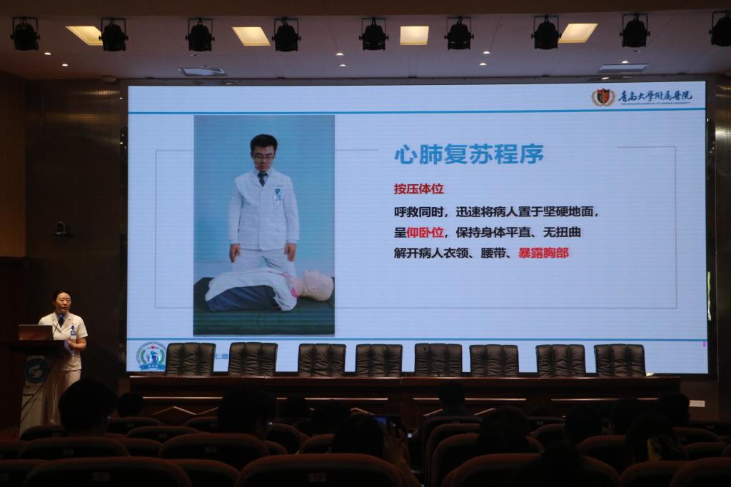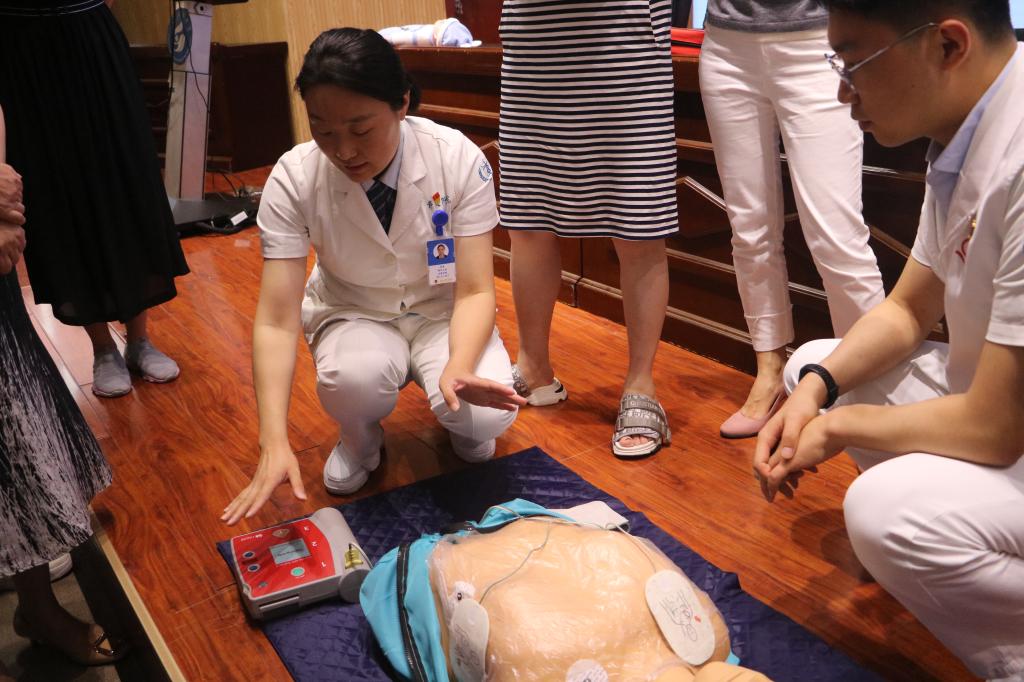 吴倩等专家从心肺复苏、AED的使用、海姆利克急救法、创伤现场急救等四个方面对急救知识进行了详细的讲解,还进行了现场演示,随后教职工进行了实操训练。