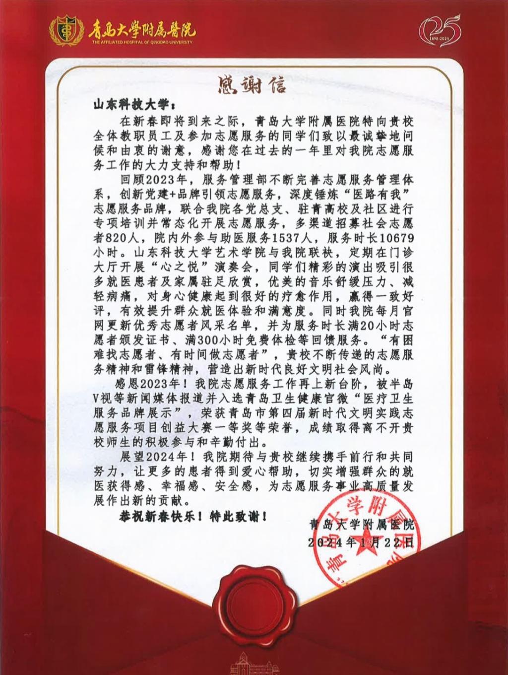 1月22 日,青岛大学附属医院西海岸院区综合服务管理部向公司师生发来感谢信。高度赞扬了过去一年申博sunbet音乐专业师生为医院倾情奉献的数场“医路有我 心之悦”公益音乐会,并感谢公司对青医附院西海岸院区志愿者服务工作的大力支持。