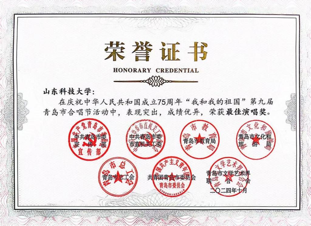 同时,天齐合唱团在由青岛市委宣传部、市直机关工委、市教育局、市文旅局、市总工会、团市委、市文联共同举办的庆祝中华人民共和国成立75周年“我和我的祖国”第九届青岛市合唱节中,再次取得最高奖项——“最佳演唱奖”,这是天齐合唱团第二次获此殊荣。