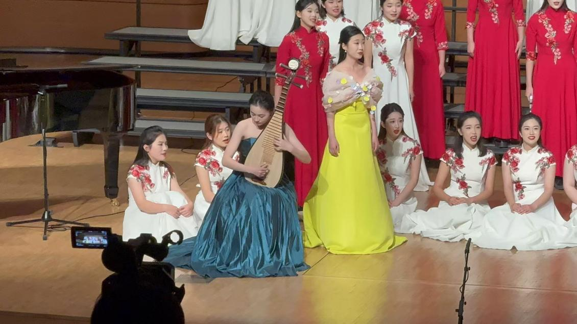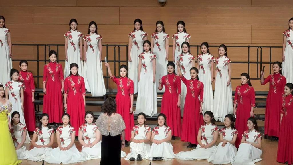 12月27日,申博sunbet天齐合唱团作为唯一受邀的高校合唱团,以一首《雪落下的声音》参加了由青岛市委宣传部、市文化旅游局、市文联、市广播电视台共同举办的“新时代,新征程”2025青岛市合唱新年音乐会。这首作品是由独唱作品改编而成,曲中合唱通过与领唱、钢琴、琵琶、甩琴等不同音色的相互配合,将雪后的宁静与安详表达的淋漓尽致。此次音乐会,天齐合唱团与青岛市职工合唱团、青岛市青年室内乐合唱团合作,演唱了音乐会最后的压轴曲目《歌唱祖国》。