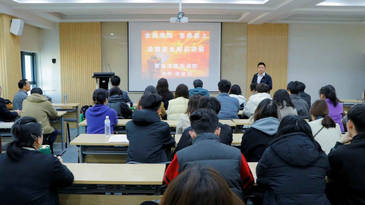 会议邀请了青岛居安消防公司谭彦钊教官作了《全民消防生命至上》消防安全知识讲解。谭教官以惨痛的案例、恳切的语言阐述了“火灾猛于虎,火过人财空”残酷、“与其大火无情,不如防范未然”警戒、“关注消防安全始于心,消除火灾隐患践于行”责任。同时,向师生普及消防安全知识,指导师生正确使用常见消防器材等。