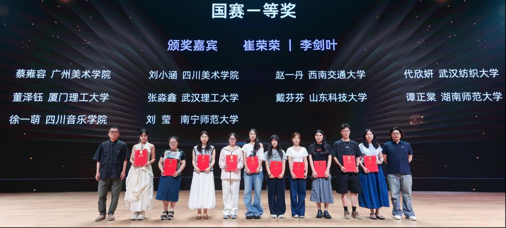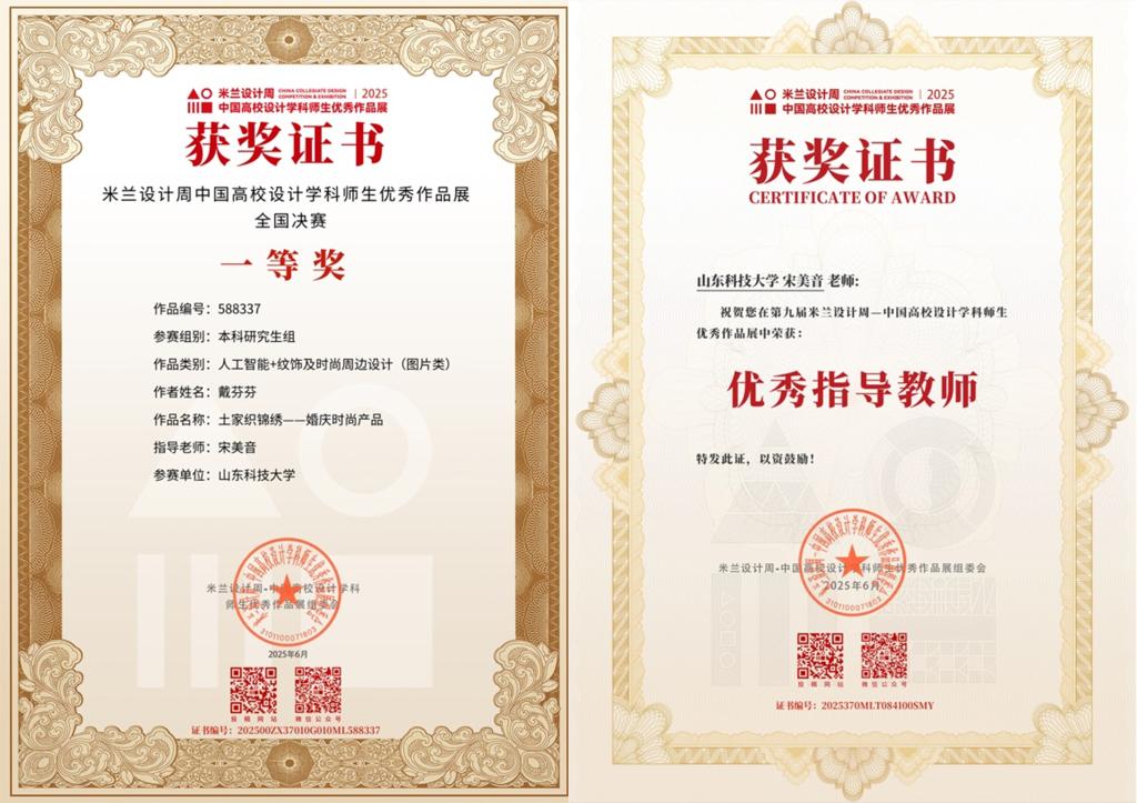 近日,从2025米兰设计周中国高校设计学科师生优秀作品展“人工智能+纹饰及时尚周边设计”课赛结合邀请赛决赛现场传来捷报。公司视觉传达设计系戴芬芬同学(指导老师:宋美音)凭借作品《土家织锦绣——婚庆时尚产品》从全国115所院校、145个教学班的激烈竞争中脱颖而出,最终在浙江理工大学举办的现场决赛中斩获国家级一等奖最高荣誉。