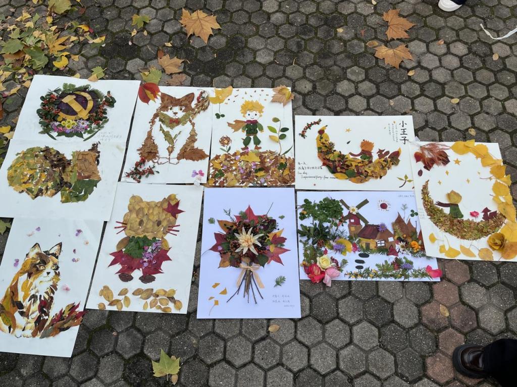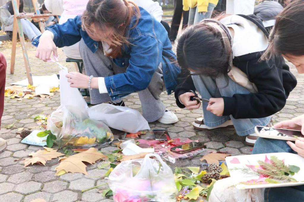 活动前期,志愿实践部的同学们主动参与筹备,带着对秋日的期待走进校园角落,捡拾形态各异的落叶,以拼贴、彩绘、剪裁等方式,将零散秋意转化为画作、书签、立体场景等作品——有的用枫叶拼出小动物,灵动可爱;有的在银杏叶上绘出绽放的花束,温柔治愈。活动展示现场,这些落叶作品有序陈列,金黄、橙红的色调瞬间拉满秋日氛围,引得路过师生纷纷驻足。大家一边欣赏作品里藏着的巧思,一边讨论落叶创作的创意,不少人表示,看着原本要凋零的落叶在指尖“重生”,既感受到了金秋的独特韵味,也体会到了低碳美学的乐趣,更定格了专属于这个秋天的温暖记忆。现场氛围轻松惬意,满是秋日里的鲜活与治愈。