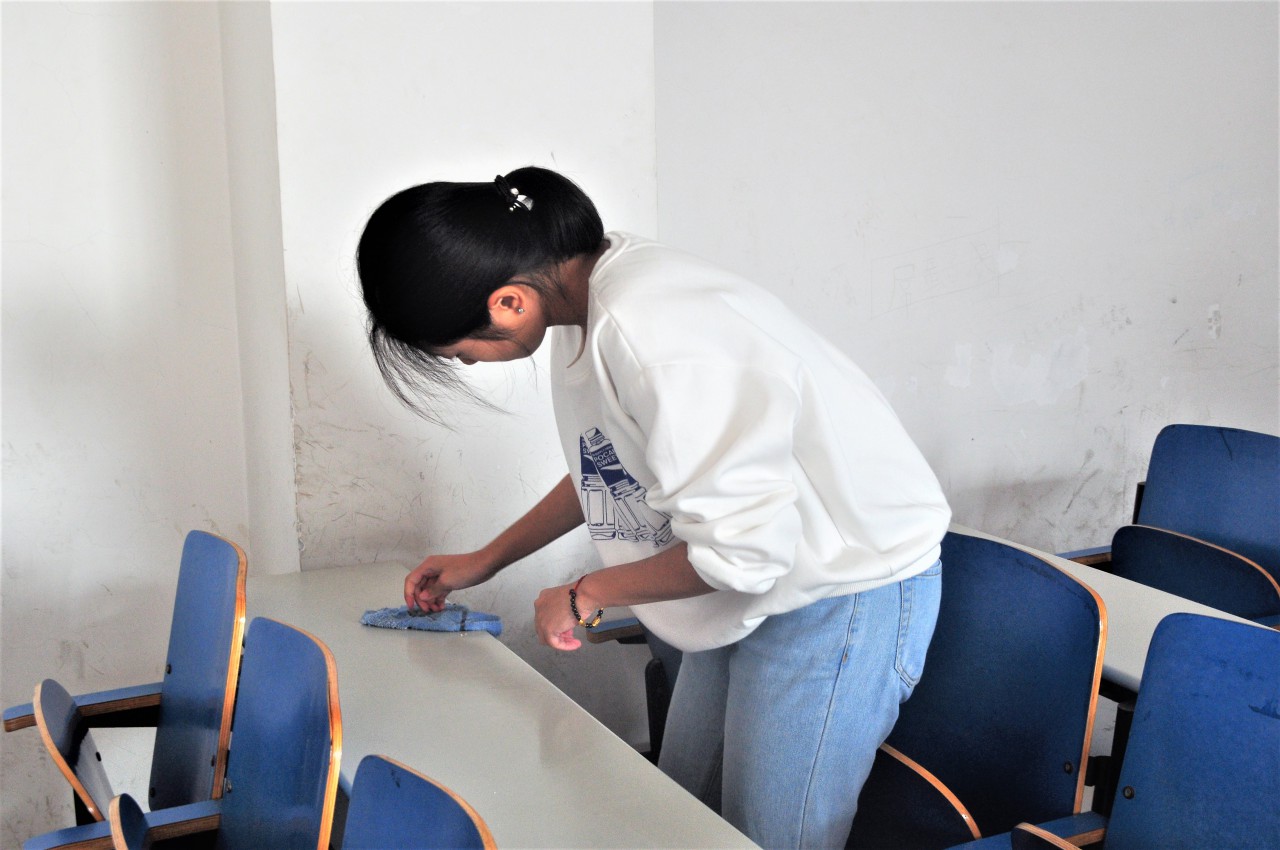 上午,整装待发的18级志愿者们有条不紊的领取清理工具后,前往指定教室开展清理工作。简单分工后,志愿者们积极迅速的投入到清理中去,用自己携带的盆、桶和抹布等工具对课桌上的涂抹等痕迹进行了认真的擦拭,在一边忙碌的清理教室课桌上的各种污渍和笔迹的同时,一边反复进行检查,使每个课桌都被擦拭三遍以上以确保清理成果达到标准要求。