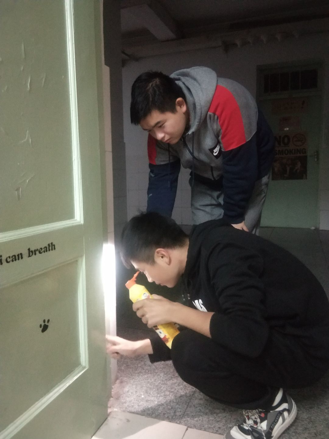 本次活动的目的旨在帮助同学们发现一些制造噪音的物品并及时维修。在活动过程中,同学们积极参与,志愿加入消噪小队积极配合工作,消噪小队志愿者们对门轴的老化程度进行了仔细的检查,并给出现问题的门轴涂抹润滑油并反复确认门轴的噪音是否被完全消除,直至确认不会再产生噪音。
