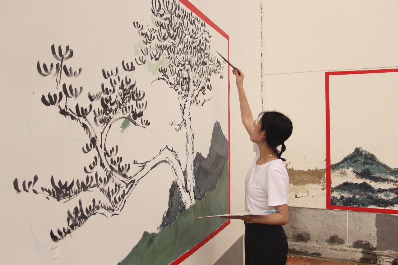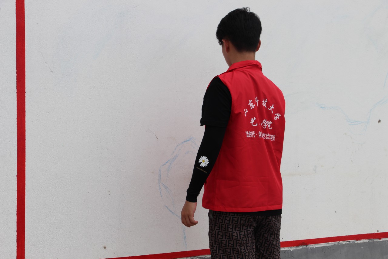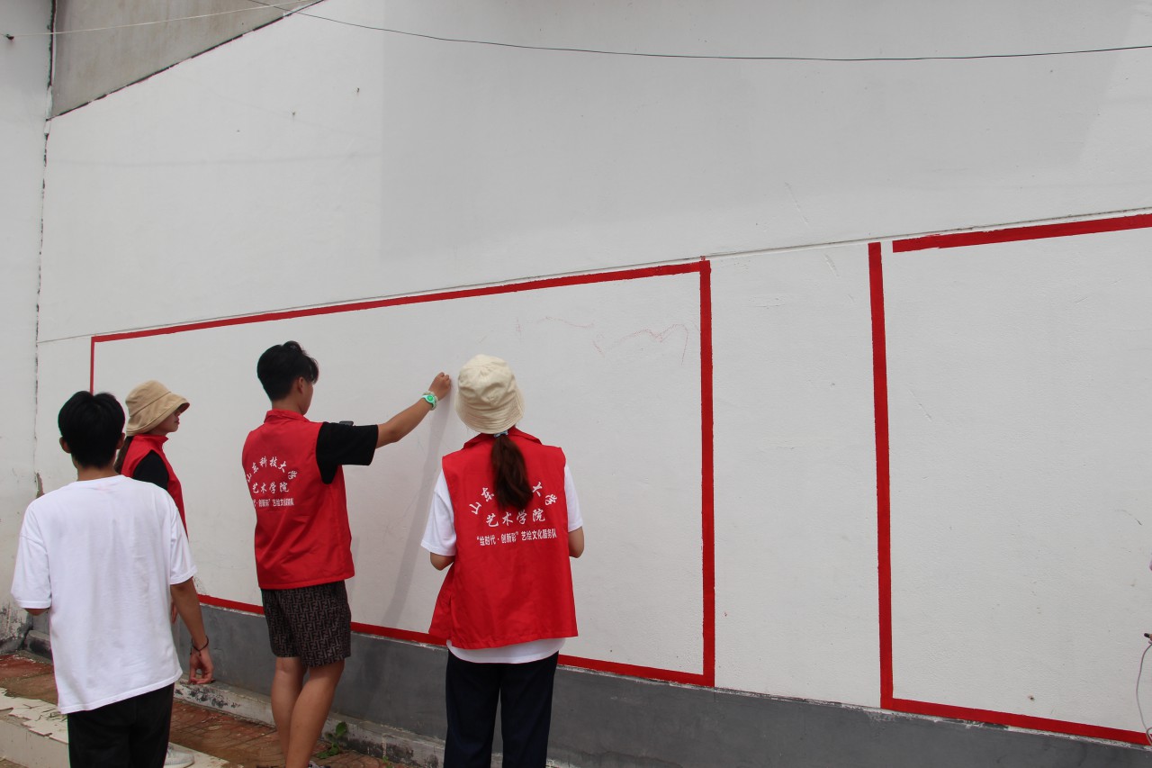 虽然烈日炎炎,但是依旧抵挡不住同学们画画的热情,衣服被汗水浸湿,双手也被颜料染脏,同学们还是没有放下手中的画笔,将自己的热情绘画在墙上,把美丽乡村建设的任务谨记心中。
