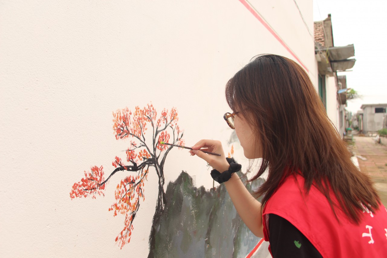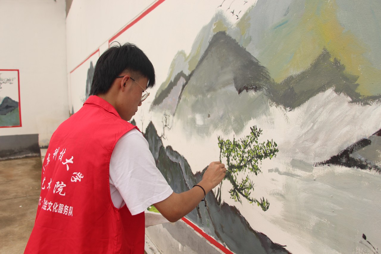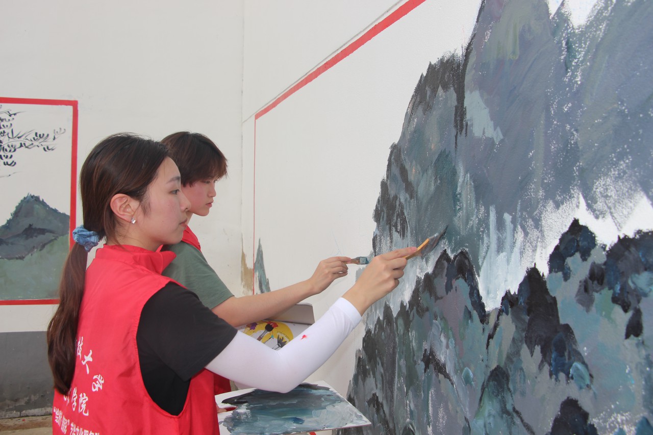 虽然烈日炎炎,但是依旧抵挡不住同学们画画的热情,衣服被汗水浸湿,双手也被颜料染脏,同学们还是没有放下手中的画笔,将自己的热情绘画在墙上,把美丽乡村建设的任务谨记心中。