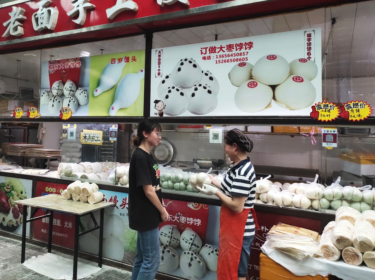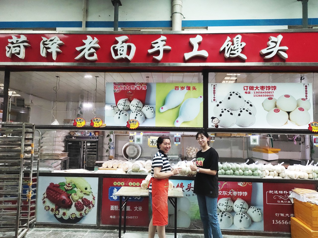 四方食事,不过人间一方烟火,受疫情影响,浓浓的烟火气似乎有所收敛,一些实体店的经营也受到了一定程度的影响,而此次社会实践活动的第一站是东升面食店,坐落于烟台福山区恒达农贸市场面食区12号,是一家主营铁锅老面馒头的老店。该店经营的面食在所在地很受欢迎,属于特色产品,但受疫情影响,销量有所下降,为了更好地响应助农扶贫的号召,带动经济恢复发展,服务队选择了这家店。