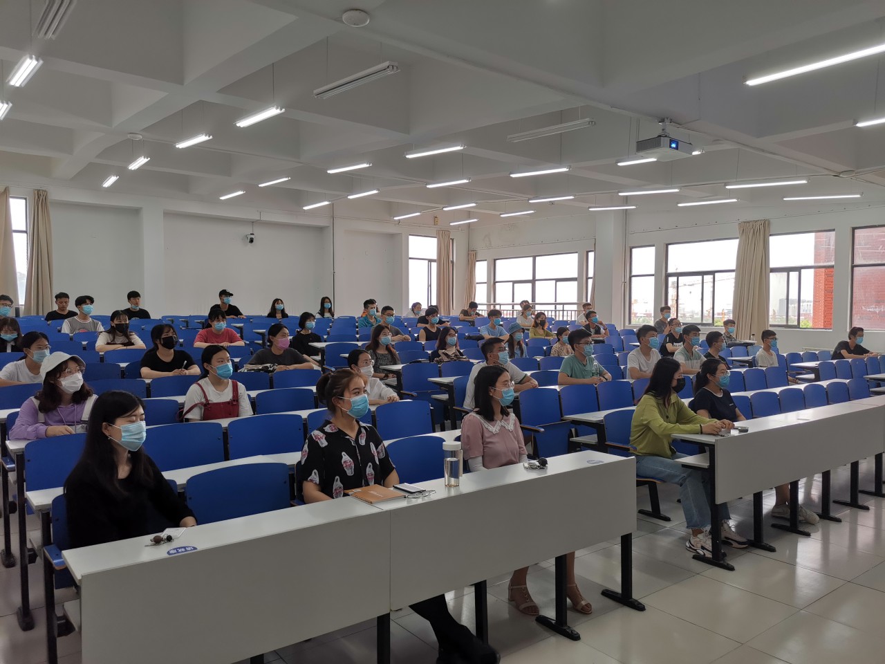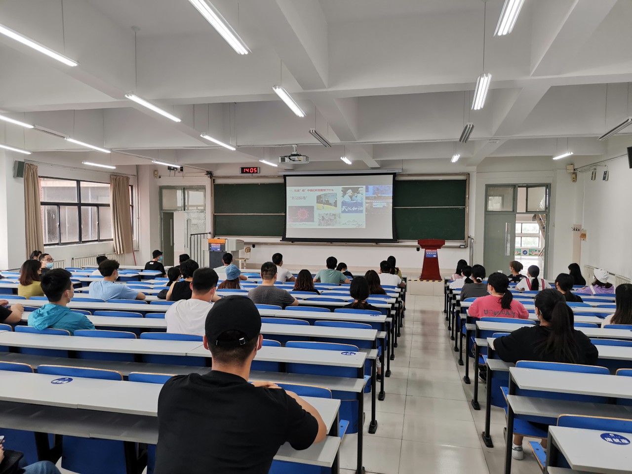 6月16日,艺术公司组织返校同学于J14-423教室、未返校同学线上收看公司党委书记罗公利为全校员工上的一堂思政大课。