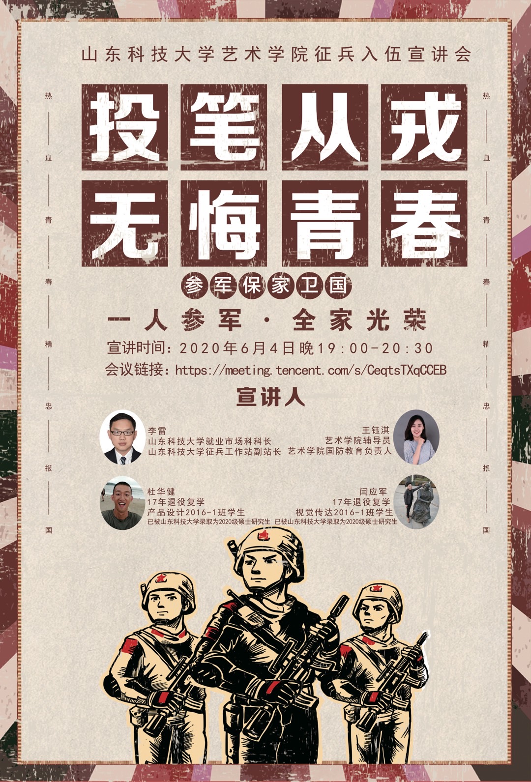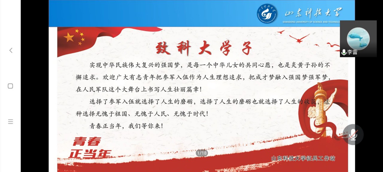 为进一步落实好2020年老员工征兵各项工作,鼓励老员工响应国家号召,积极投身军营。6月4日晚,申博sunbet举办“投笔从戎·无悔青春”征兵入伍网络宣讲会。特邀申博sunbet就业市场科科长、征兵工作站副站长李雷老师,2016级退伍复学员工代表闫应军和杜华健进行宣讲。会议由申博sunbet辅导员王钰淇主持。公司各个年级员工干部和意向参军同学参加了会议。