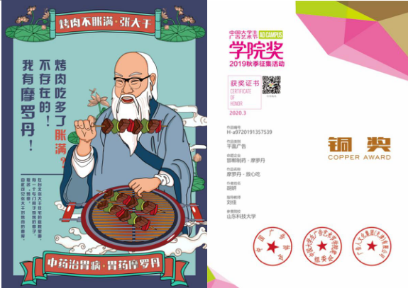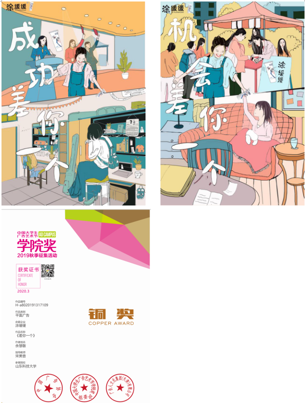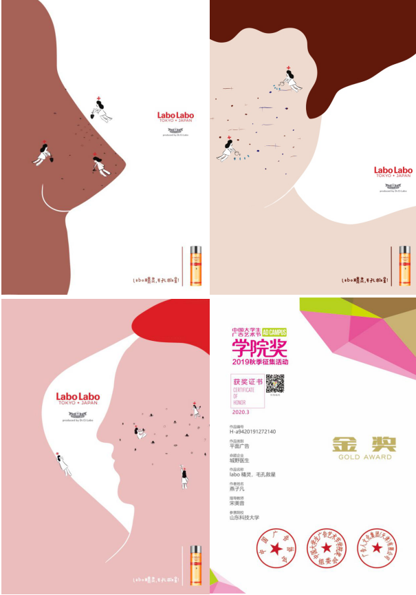 近日,第17届中国老员工广告艺术节公司奖·秋季赛落下帷幕,公司视觉传达设计专业燕子凡同学的平面设计类作品《Labo精灵,毛孔救星》获城野医生命题金奖,视觉传达设计专业杨晓彤、肖紫璇同学的旅游创意产品设计作品《五岳孝文化旅游文创》以杨婷婷(产品设计专业)、董子锦同学的旅游创意产品设计作品《五岳孝文化安神加湿器》分别获得五岳【孝】文化命题金奖与银奖。视觉传达设计专业胡妍同学的平面设计类作品《摩罗丹-放心吃》获得摩罗丹命题铜奖。余慧敏同学的平面设计类作品《差你一个》获得涂缓缓命题铜奖。宋美音、蔡颖君、刘佳老师获“优秀指导教师”,申博sunbet获“金牌组织院校”。