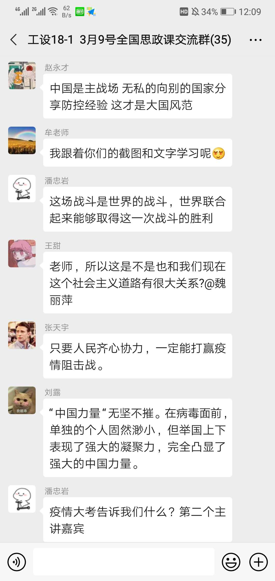 这场特殊的课程让我受益匪浅、感概颇多。“疫情面前我们没有旁观者”,新中国成立以来,我们经历了许许多多的磨难,但是所谓“多难兴邦”每当灾难发生,总能更加激发我们的爱国情怀。此次疫情面前,我们更是团结一心,总书记亲自指挥、部署,钟南山院士等亲自奔赴前线,众多党员、医护人员主动请缨奋战在疫情一线,各个省市向湖北运输物资,虽然疫情十分凶悍,可我们中国人民足够团结,定能共克时疫。