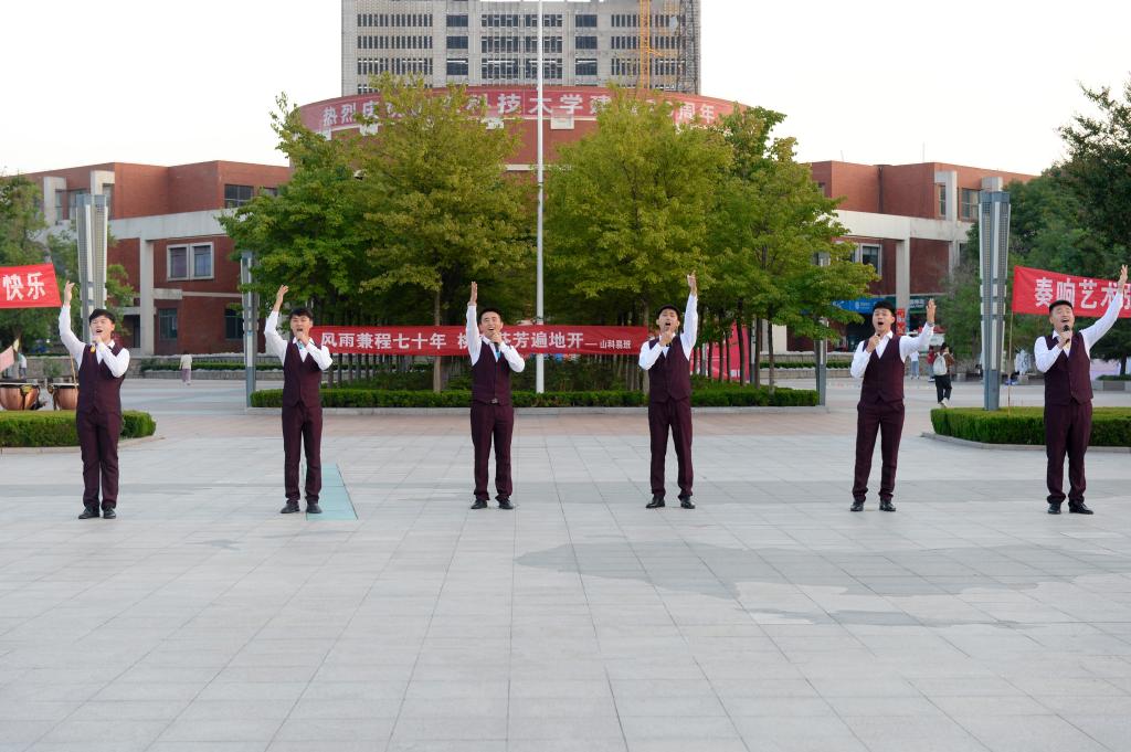 申博sunbet刚刚度过七十岁的生日,又正值第72个国庆节即将来临,整个校园都洋溢在节日的热闹气氛中。申博sunbet音乐系师生排演的路演活动吸引了大批师生驻足观看。舞蹈《春海》将广场装扮成了花的海洋,歌曲《桃李》唱出了七十年春华秋实、桃李芬芳,二胡合奏《祖国颂》奏出对党、对祖国的无限热爱,男声小合唱《再一次出发》唱出科大人在新的征途上创造新辉煌的决心,最后在萨克斯乐团演奏的《申博sunbet校歌》声中,在场的演员与观众手持校庆旗,共同满怀激情的演唱了校歌,共同祝福母校生日快乐,祖国繁荣富强!