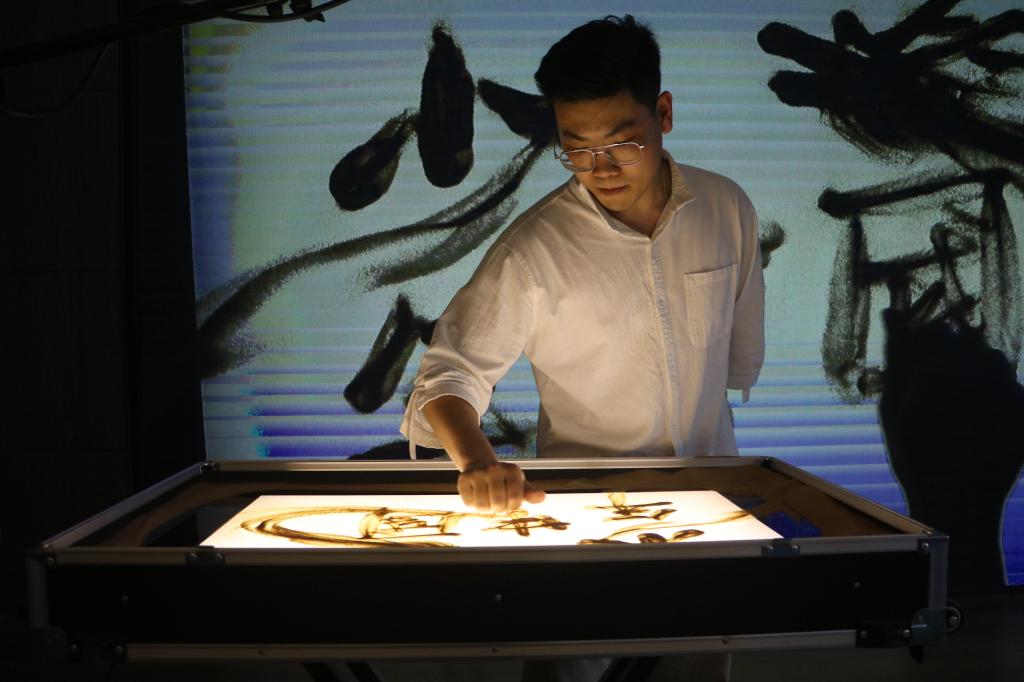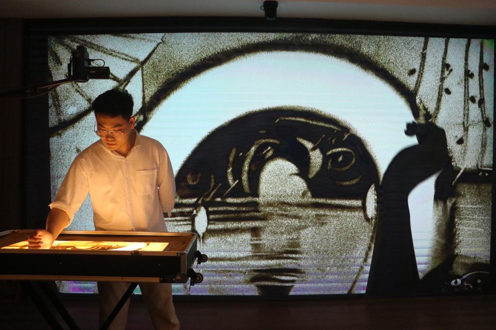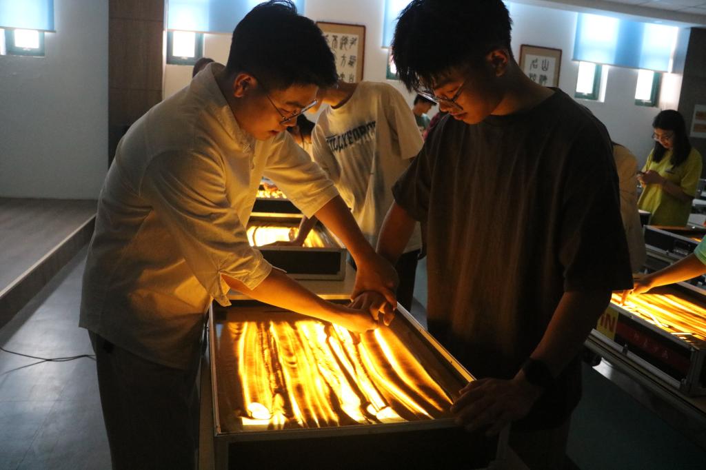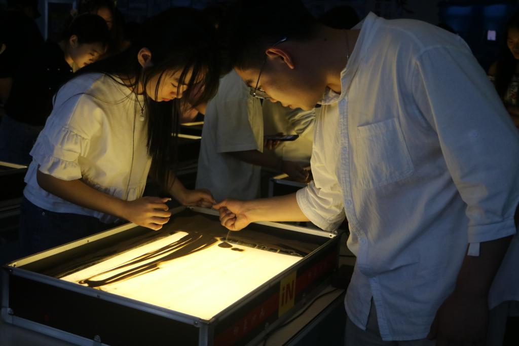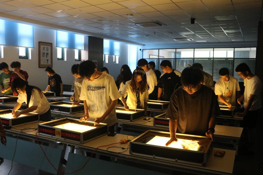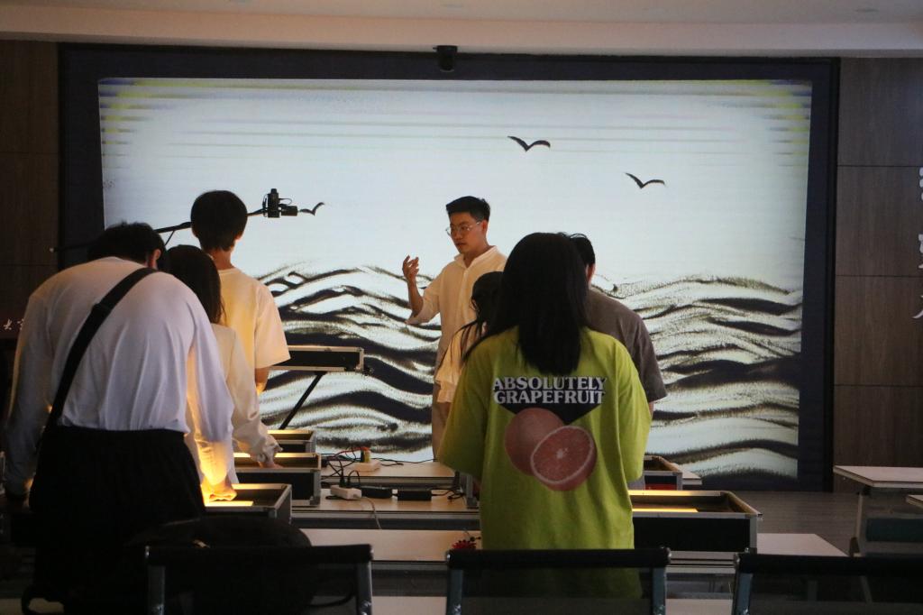 王金仕老师首先向同学们介绍了沙画的发展历程:沙画是一种利用沙子在平面上绘制图案的艺术形式,它源于中国古代的“沙盘推演”,后来发展成为一种独特的艺术形式。随后,他向同学们展示了沙画的创作过程,讲解了沙画最基本的艺术表现形式,引导大家运用漏、勾、捏等简单的方式尝试沙画创作。老师用手做漏斗状,捧一拳沙,沙子在空中自如挥洒,来回地撒在画台上。荧荧白光屏,簌簌沙落声,生动形象的画面随着王金仕老师的动作不断变换。初体验过后,同学们充分感受沙画的魅力,真正走进了沙画艺术当中。活动最后,老师以一幅“荷塘月色”为此次沙画体验活动做了完美收尾。