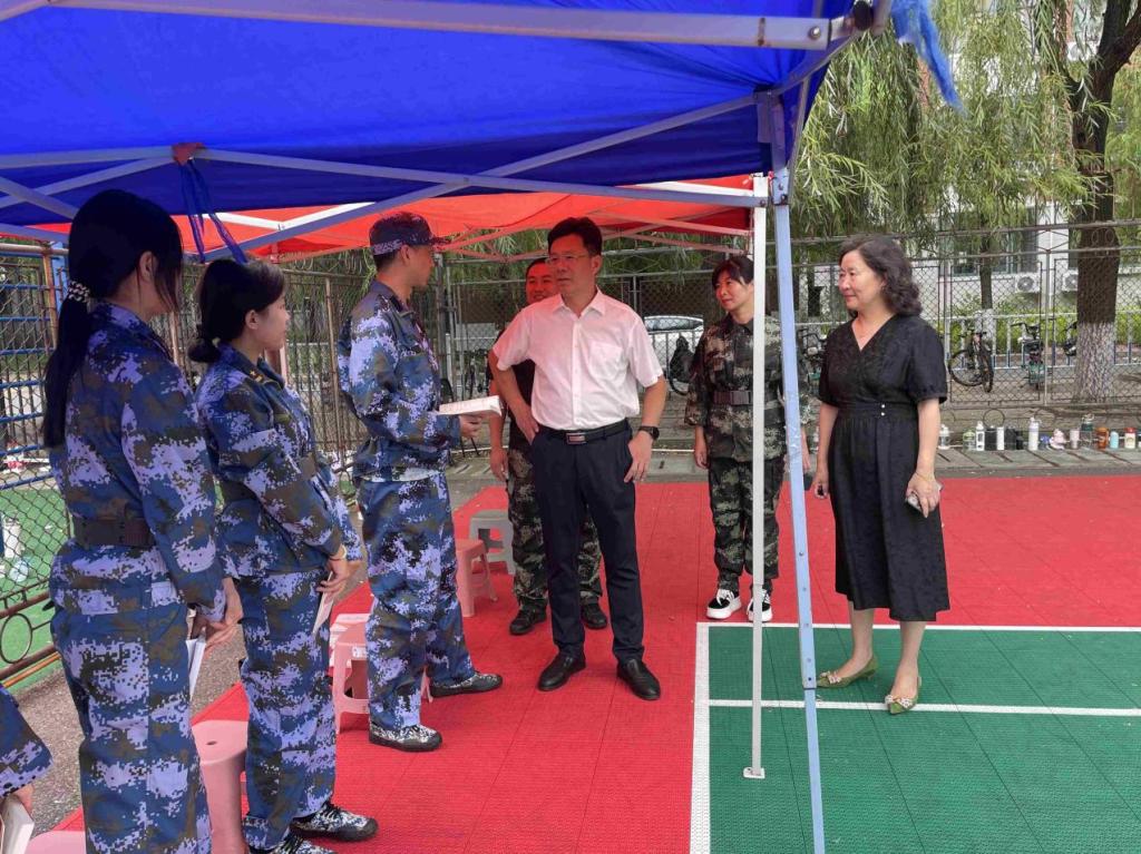 8月26日,公司领导班子来到军训场地察看2022级员工军训工作,党委书记王凯、经理杨梅、党委副书记兼副经理卫雪在辅导员李云坤的陪同下,为军训教官和参训同学送去慰问,并详细了解军训进展情况。
