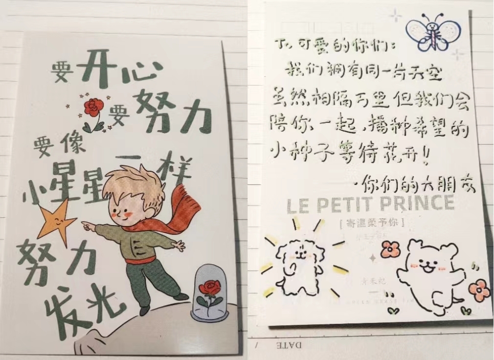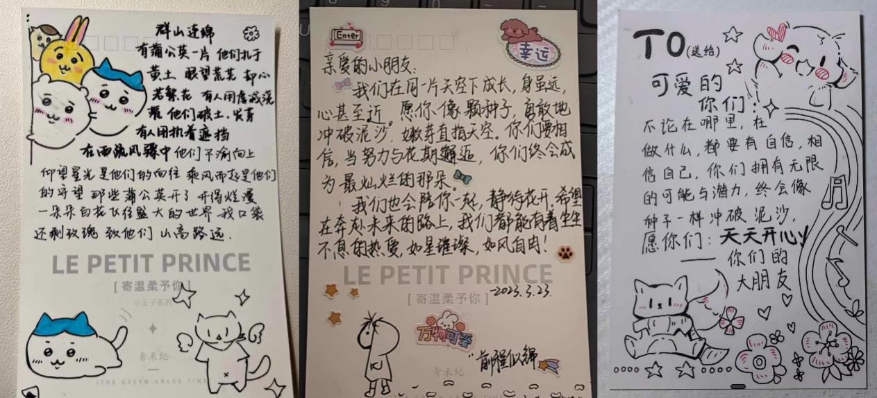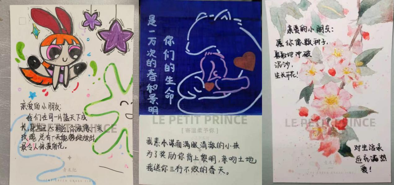 活动开始,志愿者们亲手写下信件,希望能够在书信往来中成为留守儿童的倾听者,帮助他们排忧解难,照亮他们孤独的心灵。“我们在同一片天空下成长,身虽远,心甚近”“你们的生命是一万次的春和景明”,一句句亲切的话语都是对留守儿童们的祝福,志愿者们用文字传递暖心的鼓励,构建心灵交流的桥梁。大家将自己对留守儿童的关心与祝福、自己的学习成长经验以文字和绘画的形式表现在明信片上。活动最后,工作人员将明信片上传至社交平台推广,以电子版的形式,让更多的人了解到关爱留守儿童的重要性。