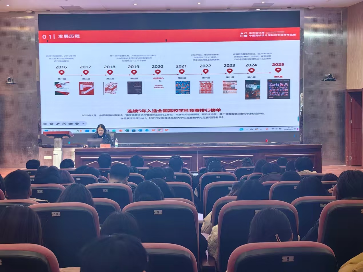 宣讲会上,宋美音老师首先介绍了米兰设计周竞赛含金量高,连续五年被评为教育部竞赛榜单B类赛事,并强调赛事整体概况及其在全国高校及设计界中的重要地位。然后宋美音老师详细解析了今年的比赛主题和各命题类赛道参赛要求,包括:非遗数字文创—锦绣设计大赛、二十四节气文化作品设计大赛、“盘锦礼物”设计大赛、“阳明文创”创意设计大赛、艺术疗愈与媒介设计、天空盒“幻想生物”数字艺术设计等。此外,重点推荐专项赛场中的文创产品设计专项赛和公益赛道的中国博物馆文创产品设计赛道,其中“让文物创意亮起来”中国博物馆文创产品设计赛”是国内首个与多家博物馆开展合作的专项赛,将由十多个博物馆参与合作命题。宋老师强调米兰设计周与产业结合非常紧密,同学们的获奖作品能够产业化、商业化。在产业化转化方面,大赛主办方会有更多赋能渠道,让获奖作品加强商业化应用与转化。然后宋老师详细分析了“二十四节气”、“设计赋能土特产,助力乡村振兴”、“阳明文创”这些获奖作品的设计理念及作品创意亮点,让同学们在欣赏佳作的同时,也深刻体会到了作品创意的魅力和艺术价值。通过获奖案例分析,激发同学们的创作灵感并提供有益的设计参考。同时宋老师鼓励同学们结合现代科技理念,创作出既有文化内涵又具时代特色的作品。另外,宋美音老师建议同学们在准备作品时,不仅要注重作品的创新和形式美感,还要充分考虑市场需求和消费者喜好。最后,宋美音老师详细介绍了米兰设计周赛事的投稿方式、各个赛道的截稿时间以及评审流程,提醒同学们务必注意各个命题赛道的截止日期,确保作品能够按时提交。国赛评审结果6月份公布后,随后将举办一系列颁奖礼、研讨会、巡展、工作坊等活动。