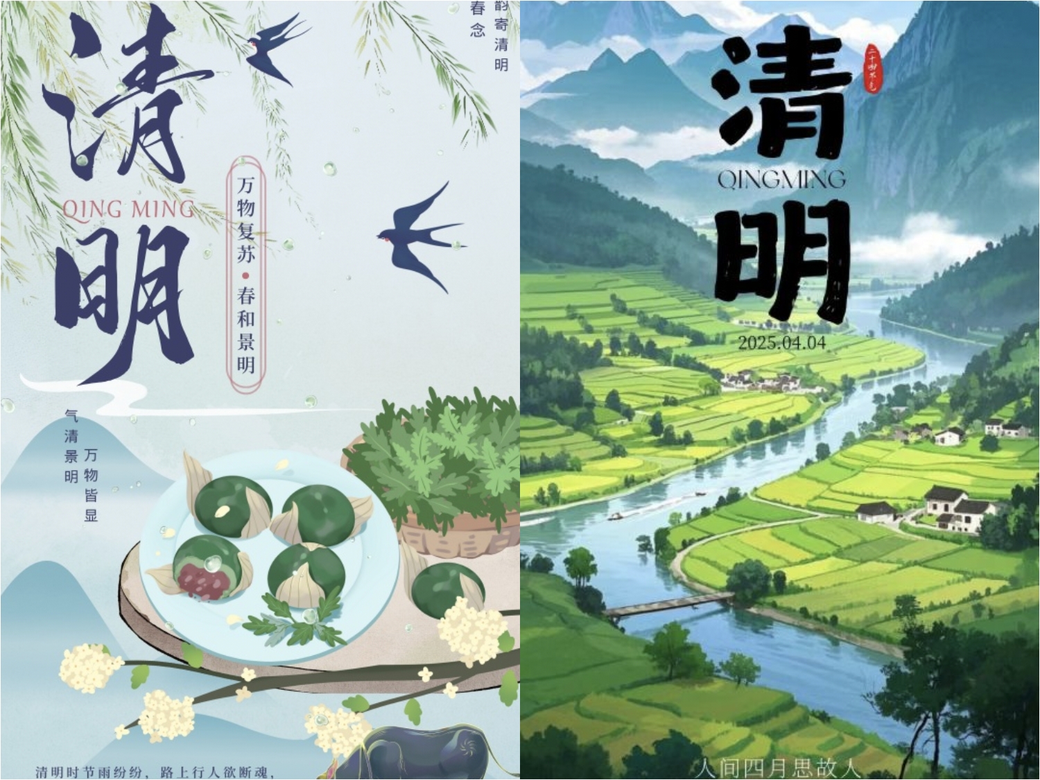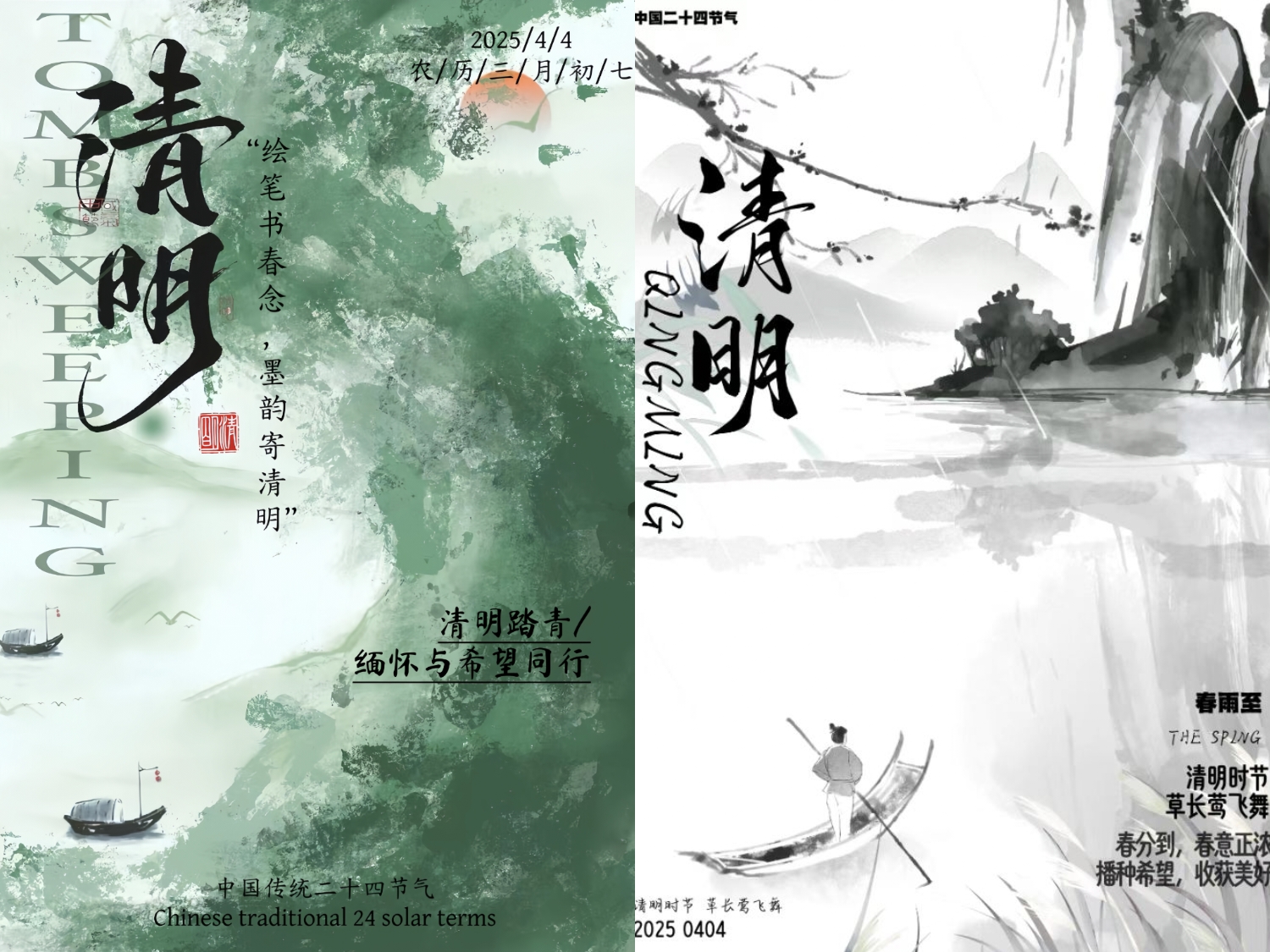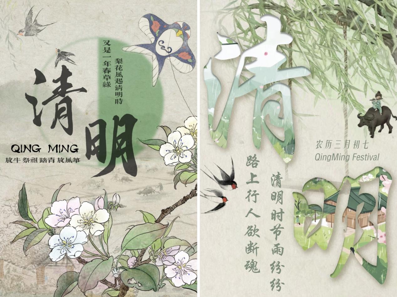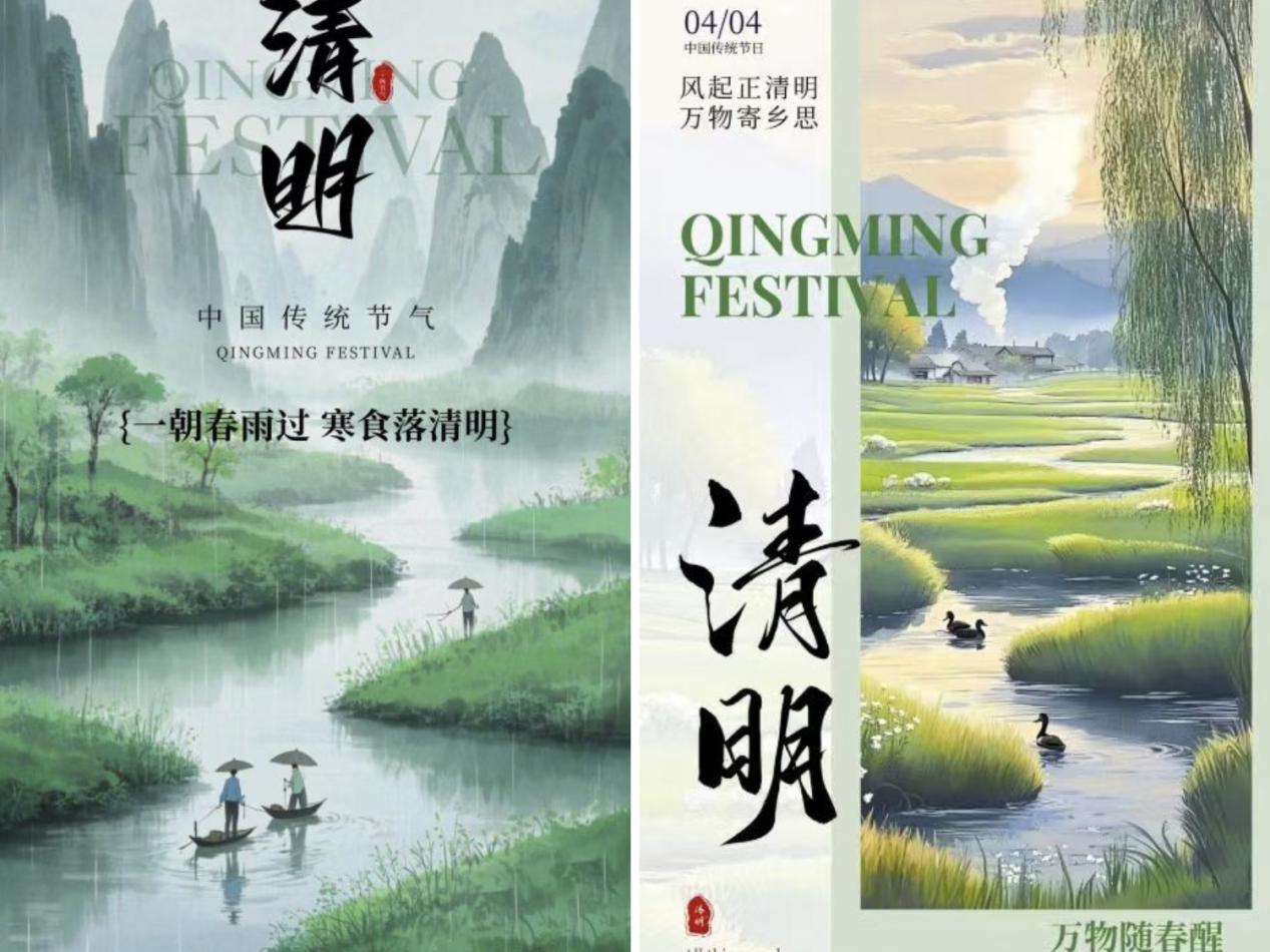此次活动紧扣清明节的特点,巧妙融合春天的蓬勃生机与清明追思的深沉情感。在此次比赛作品中,其中一幅海报以朦胧山水为背景,于烟雨中绘有撑伞划船、垂钓之人,配上“一朝春雨过 寒食落清明”的文案,尽显清明时节承接寒食、春雨润泽的特点;一幅则展现春日田园之景,蜿蜒河流、游动鸭子、依依垂柳与袅袅炊烟相互映衬,呈现出清明万物复苏的蓬勃生机。参与此次活动的员工蒋文硕表示,创作让她深入理解清明文化,提升专业技能,对传统文化更生敬意,以后会更积极参与此类活动。