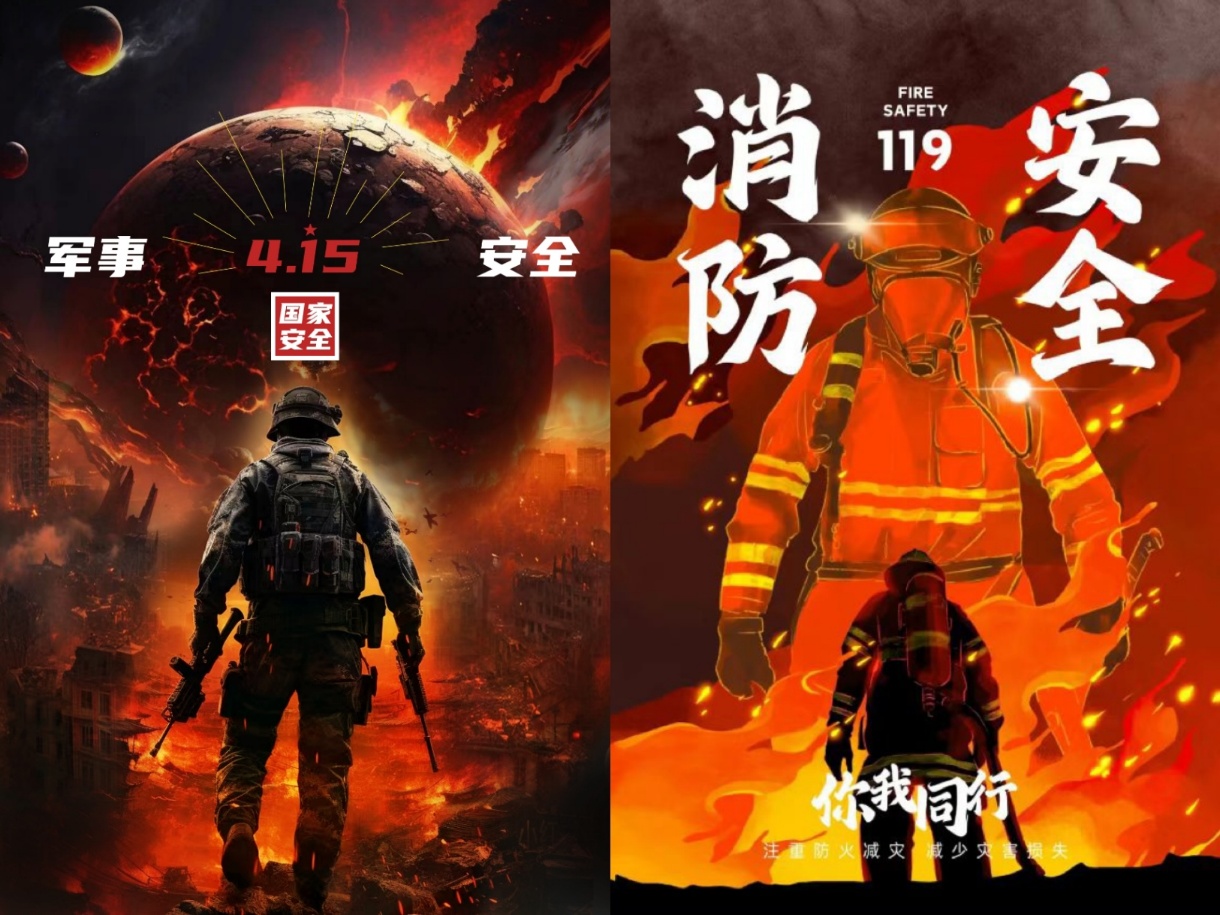 活动分为两大环节:互动体验和海报展览。在互动体验区,同学们从工作人员处的提箱内随机抽取写有各类安全主题的纸条,抽取后按照所抽主题阐述一条与之紧密相关的关键要点或注意事项,借此加深对不同安全领域的理解与认识。在海报展览区,作品《防线》以“4.15”为元素,构建卫国战士立体造型,手持武器抵御保家卫国,象征军事对国家安全的重要性;作品《逆焰·共生》消防员背影与烈火漩涡构成画面中心,橙红火焰纹理中穿插消防员手持破拆工具、呼吸面罩等元素,凸显“以勇御灾”的消防精神与消防安全的重要性。活动结束后,同学们纷纷表示收获颇丰,将专业学习与国家安全知识普及相结合,既提升了专业能力,也增强了维护国家安全的责任感与使命感。