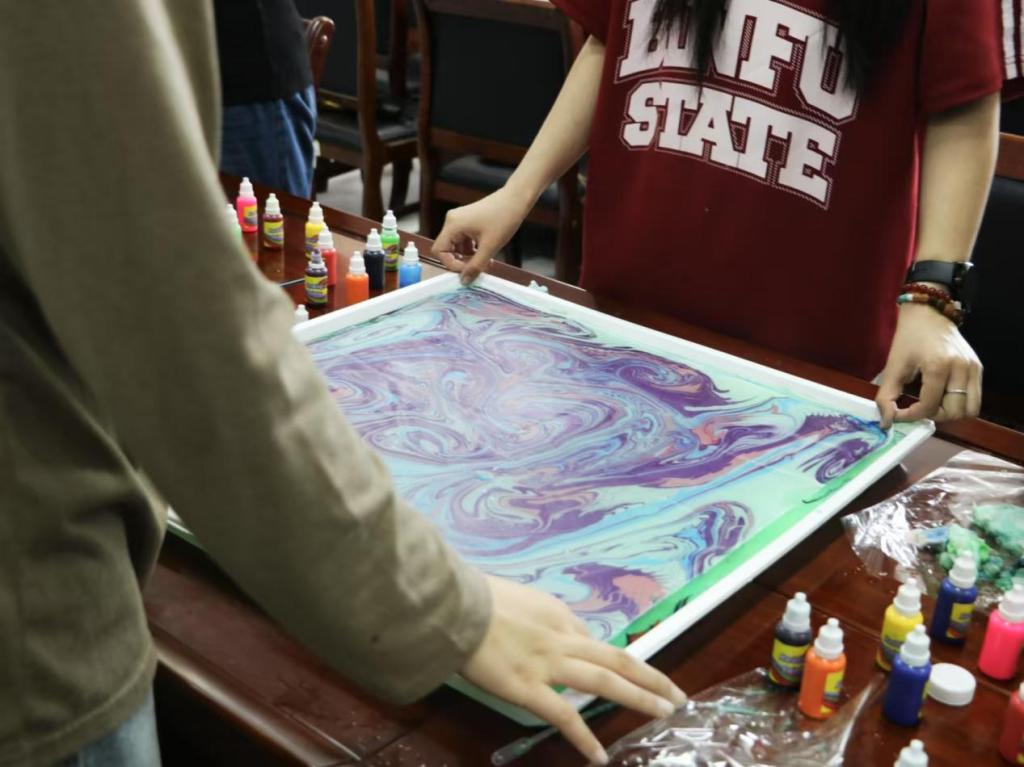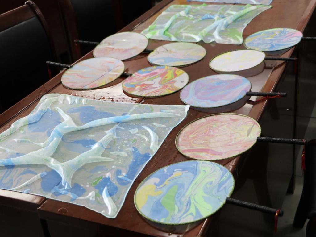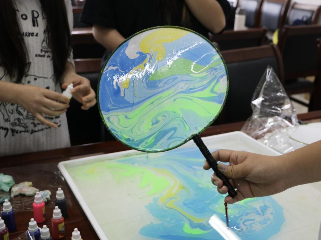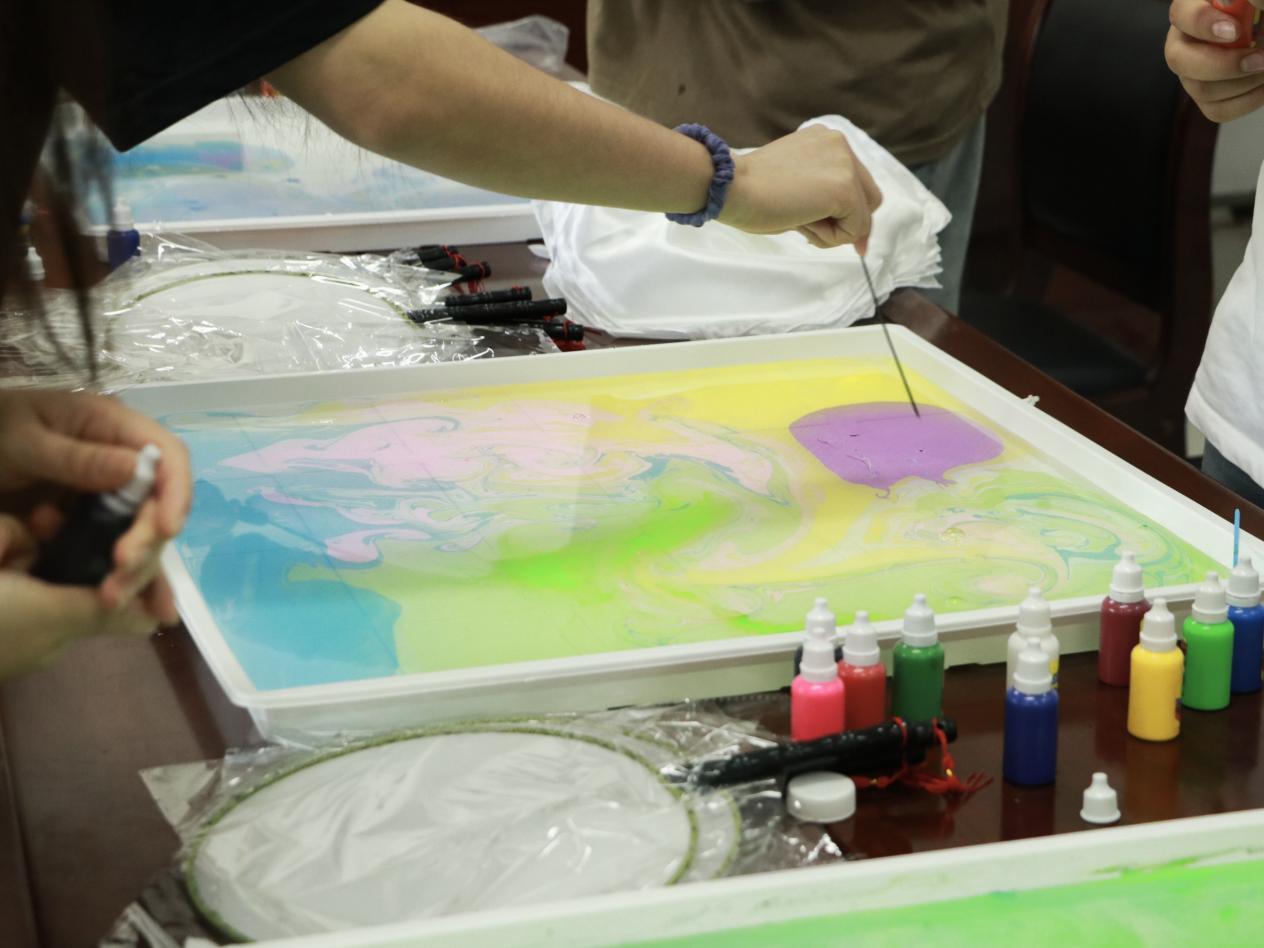 活动现场,工作人员准备了高浓缩液、各色颜料、丝巾和扇面等材料。首先,工作人员详细介绍了水拓画的起源与文化。同学们随即开始动手创作,滴入颜料、勾画图案、拓印图案、浸泡固色、晾干,每一个步骤都一丝不苟,认真细致,在亲手操作中感受水与色交融的独特美感。随着颜料在水面流动、定型并被拓印,空白的丝巾和扇面逐渐浮现出各具特色的纹样,成为承载同学们创意的独特作品。视觉传达设计2024-1班的吴国胜同学分享道:“本以为水拓画很简单,动手做才发现每个步骤都需要仔细操作。比如颜料滴入水中的扩散效果、勾画的力度都很有讲究。当最后成功拓印出图案时,真的特别有成就感!”