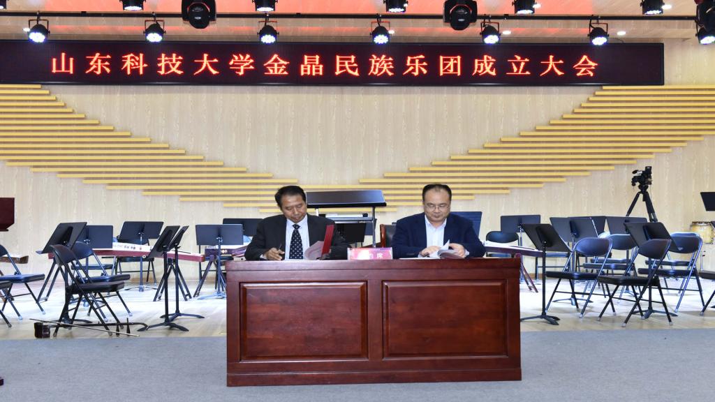 会上,尹华与刘圣佑共同为申博sunbet金晶民族乐团揭牌。李克周与崔文传分别代表双方签署了合作协议,向申博sunbet音乐系副主任薛源颁发了民族乐团指挥聘书。