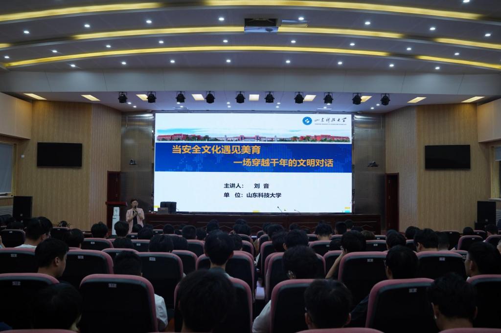 主讲人刘音,安全与环境工程公司教授、山东省教学名师,国家课程思政教学名师、全国黄大年式教师团队核心成员,安全工程专业主要负责人之一。刘老师从自身实际经历出发,强调安全文化教育的重要性,并巧妙衔接至更深层次的文化与美育思考。随后,刘音老师从汉字演变的视角,深入解析了“安”与“全”二字从从古至今的形态变化与文化内涵。她从历史维度梳理了安全文化的发展脉络,不仅涵盖中国古代的建筑防灾智慧、饮食卫生观念,还延伸至近代工业安全体系的建立,特别以杜邦企业的安全文化建设为例,说明现代企业如何将安全价值观融入组织行为中。刘老师强调,安全不仅是一种制度,更是一种文化、一种文明体现。讲座内容广泛而具象,从“安全文化与美食”谈到饮食健康与食品安全,从空气污染与水资源保护引申至环境美学与生态伦理,再到建筑安全中蕴含的结构美学与人文关怀——刘音老师以多学科交叉的视角,打破了传统安全教育的框架,展现出美育在塑造人的安全意识与文明素养中的深远意义。