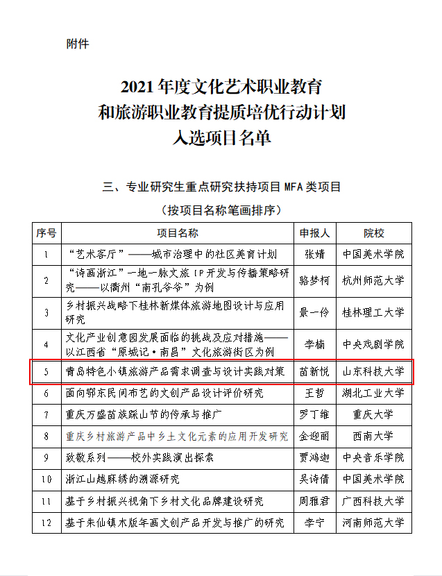 近日,文化和旅游部办公厅公布了2021年度文化艺术职业教育和旅游职业教育提质培优行动计划入选项目名单。其中,公司2020级艺术硕士环境设计方向研究生苗新悦申报的“青岛特色小镇旅游产品需求调查与设计实践对策”获批文化和旅游部科技教育司“文化艺术职业教育和旅游职业教育提质培优行动计划专业研究生重点研究扶持项目MFA类项目”,成为我省唯一一位获此项目员工。