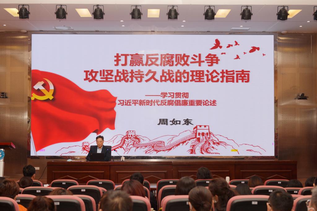 周如东带领大家认真学习习近平总书记关于党风廉政建设和反腐败斗争重要讲话精神,从对新时代反腐倡廉形势的判断、习近平新时代反腐倡廉重要论述、习近平新时代反腐倡廉论述的价值三个方面系统讲述了新时代反腐倡廉的重要理论和重要举措,强调全体党员干部和师生要加深对新形势下党风廉政建设和反腐败斗争的认识,提高一体推进不敢腐、不能腐、不想腐能力和水平,在以习近平同志为核心的党中央坚强领导下,全面打赢反腐败斗争攻坚战、持久战。