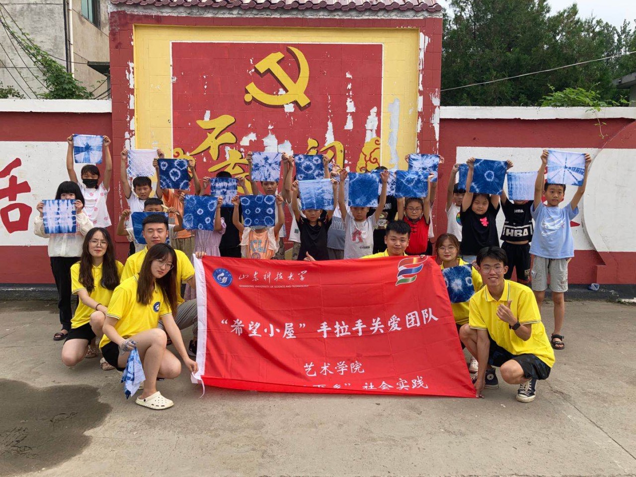 以爱心传播艺术魅力,以耕耘助力梦想船帆。弘扬艺术馨香是关爱团队成员们的职责所在。团队成员带领花园镇的小朋友们体验扎染的乐趣,体验传统艺术的魅力。在充分地讲解后,同学们跃跃欲试,很快融入扎染的乐趣中。扎染制作,染前处理,捆扎染色……一步步循序渐进。完成的染布花纹风格多样。当艺术之花开在手中。团队不忘每日总结,严格进行会议讨论,确保以最好的课堂质量引领孩子们学习。团队成员用专业知识搭建“希望小屋”,将艺术带进花园社区,提高时代新生的审美意识。
