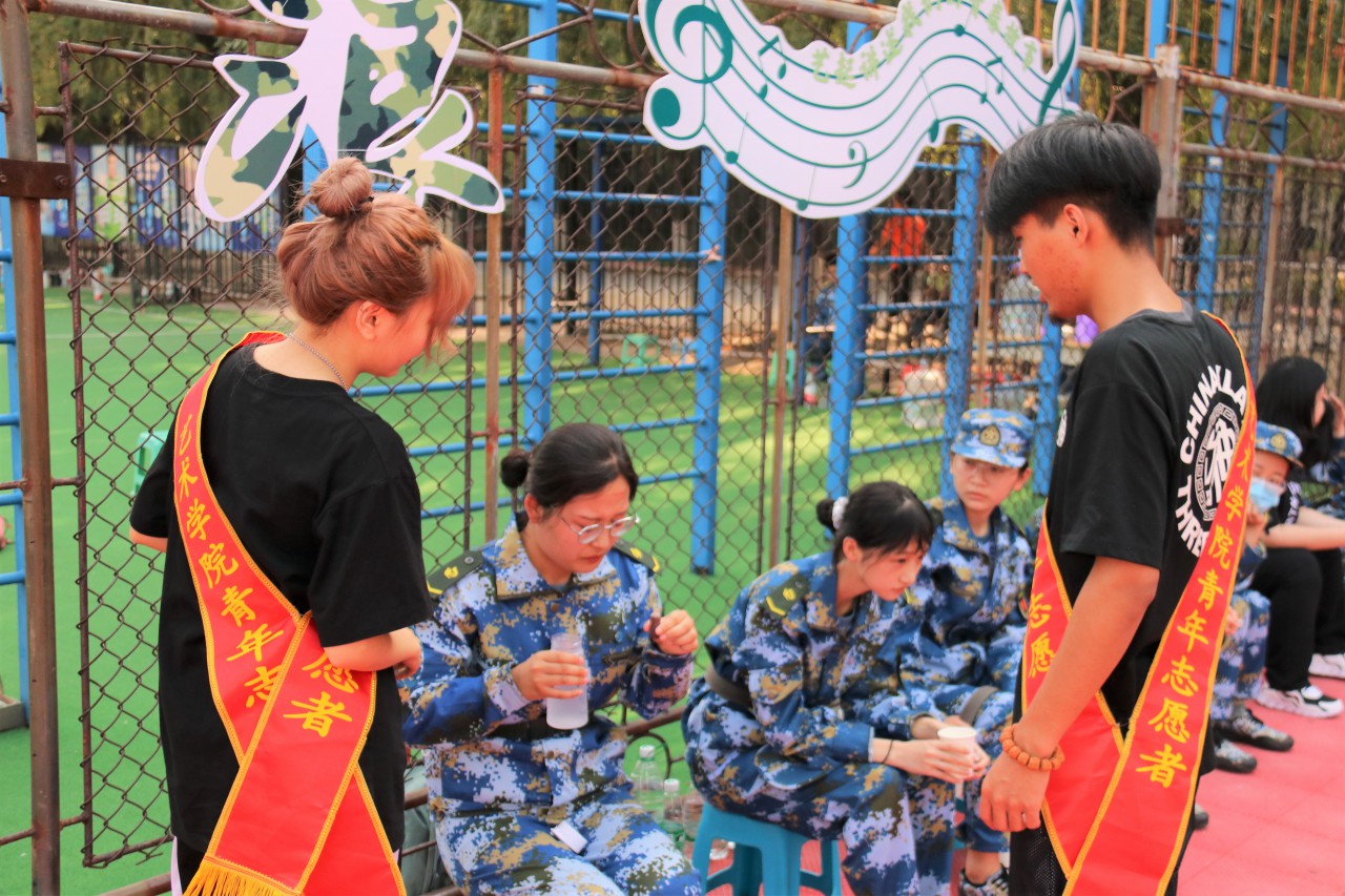 从入学到军训,志愿者们的身影就一直活跃在新生生活训练的各个角落。他们秉持着“奉献、友爱、互助、进步”的高尚精神,与新生们风雨相伴,共迎挑战。军训场地,志愿者们提前用保温桶为全体新生备好了充足的温水、贴心为新生们接水、为教官送去利喉药和茶水,缓解教官疲劳的嗓子。除此之外,志愿者还为同学们早早准备好齐全的防暑药品以及基本医疗物品,及时接应和照顾感到不适或中暑的同学。志愿者们牺牲了自己的休息时间,给新生带来细心的关怀与温暖,让新生更顺利地完成这场青春与热血的挑战。