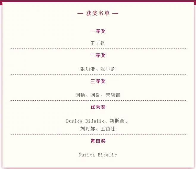 本届比赛自2020年10月1日启动以来,共有来自全球6个国家近800人参加。历时一个月的初评专家组评审后,共有40位选手入围复赛。经严格复赛评审后,20名选手进入决赛。经七位评委最终评审,来自意大利博洛尼亚音乐公司的王子祺斩获本次大赛一等奖;上海音乐公司张功浩、美国茱莉亚音乐公司张小孟分获二等奖;刘畅、刘哲、宋晓霞获得三等奖。中国艺术歌曲国际声乐比赛由上海音乐公司发起并于2018年举办了首届比赛。作为中国艺术歌曲的历史重镇,上海音乐公司举办艺术歌曲声乐比赛,是积极推动中国艺术歌曲事业发展的举措之一,除了不断挖掘中国艺术歌曲宝藏、加强理论研究之外,更要继续推动创作,推动中国艺术歌曲走向世界。作为一项常规性比赛,该赛事每两年举办一次。